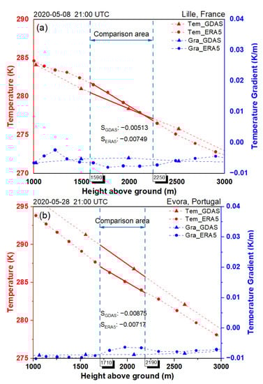 (a) The temperature profiles from Lille: 08 May 2020 21:00 UTC corresponding to the case with the highest deviation of the aerosol extinction shown in Figure 1; (b) The temperature profiles from Evora: 28 May 2020 21:00 UTC corresponding to the case with the lowest deviation of the aerosol extinction shown in Figure 1. Red lines indicate the temperature profiles and blue lines indicate the temperature gradients. The triangle and round shape represent the data from the GDAS and ERA5 models, respectively. The ‘comparison area’ represents the data range used to calculate the deviation, and the S values represent the gradient of the linear fit line of the temperature in the ‘comparison area’ from different models.