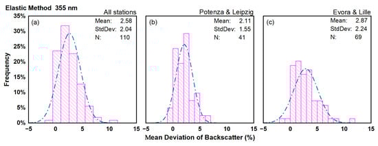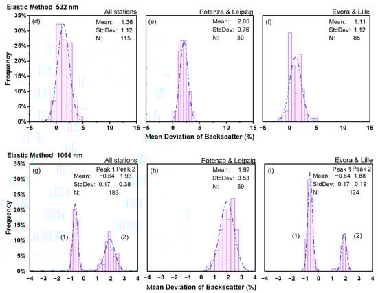 As for 532 nm, the frequency distributions show the different shapes reported in Figure 11e,f. For the Potenza and Leipzig stations, the distribution shows one peak centered around 0.55%, with a 79.5% probability of having a mean relative deviation of the backscatter within . For Evora and Lille stations, there are two peaks: one at −1.58% for Evora and another at 0.58% for Lille. Both distributions have almost the same standard deviations.