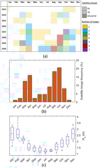 (a) Acquisition dates of the different Landsat-8 and Sentinel-2 A/B images belonging to the dataset; (b) distribution of these images per month; and (c) average monthly value of the significant wave height (Hs) computed over the period 2013–2020.