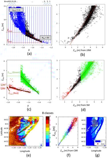 Illustration of the satellite-derived bathymetry linear regression (LRM), switching (SM), and cluster-based regression (CBR) methods for the 10 September 2020 Sentinel-2 cropped image. (a) Data filtration procedure for the green band. X is the log-transformed green band. Zsitu is the field-reduced depth (in m). The entire range of X values are divided into 20 bins of equal sizes comprised between Xmin and Xmin. Nbin and σbin are the number of observations and the standard deviation of Zsitu values per bins, respectively. When Nbin is lower than 30 or σbin higher than 1 m, observations of the bin are removed (blue points). The red line is associated with the linear regression model for the green band (LRM-G) computed from filtered observations (black points). Zmin and Zmax correspond to the minimum and maximum values of Zsat computed from LRM-G. (b) Comparison between Zsat derived from LRM-G and Zsitu. (c) Computation of the linear regression model for the red band (LRM-R), Zmax and switching points (, ). (d) Comparison between Zsat derived from SM using LRM-R and LRM-G and Zsitu. Black points are associated with the smoothing interval. (e) Example of classification of satellite image pixels into 8 optical classes using a k-means classifier. (f) Comparison between Zsat derived from CBR and Zsitu. The color of points is associated with the color of optical classes. (g) Location of Zsitu data points used in this example for calibration of LRM, SM, and CBR.