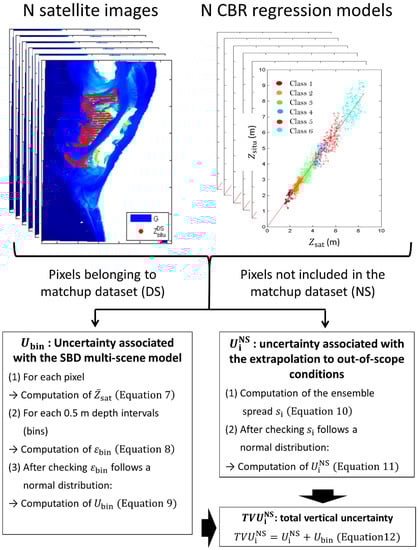 The calibration dataset often only partially covers the study area (Figure 3g). For pixels associated with areas that were not sampled and were, therefore, not included within the calibration dataset (here, referred as unsampled pixels), quantification of SDB uncertainty requires taking into account 2 terms (Figure 4). The first term was associated with the uncertainty of the SDB regression model. The second term was associated with the uncertainty generated by the extrapolation of the SDB model beyond the calibration domain. To estimate these 2 terms, an uncertainty model based on a multi-scene approach was proposed. We expressed the uncertainty as a positive value and assumed that error follows a normal distribution.