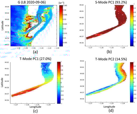 (a) Optically deep-water study area (red line) for analysis of the spatio-temporal variability of Rrs at the green band (noted G) using the 89 Landsat-8 and Sentinel-2 images; (b) the first principal component of the PCA using the S-mode orientation, which explains 93.2% of variance; (c) the first and; (d) the second principal components of PCA using the T-mode orientation, which explain 27.0% and 14.5% of the variance, respectively. Spatial patterns are presented as homogeneous correlation maps.