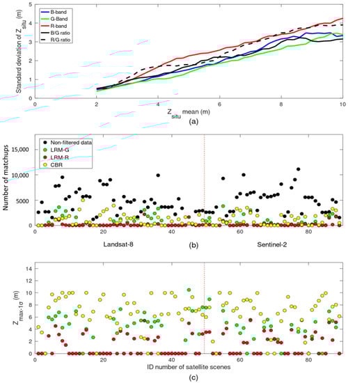 (a) Evolution of the standard deviation of Zsitu as a function of Zsitu mean computed over the 89 Landsat-8 and Sentinel-2 images for the different parameterizations of log-transformed bands and ratios; (b) number of matchups available for each of the 89 satellite images for non-filtered data and for 1σ-filtered data using LRM-G, LRM-R, and CBR approaches; (c) computation of the 1σ-filter maximum bathymetry for each of the 89 satellite images.