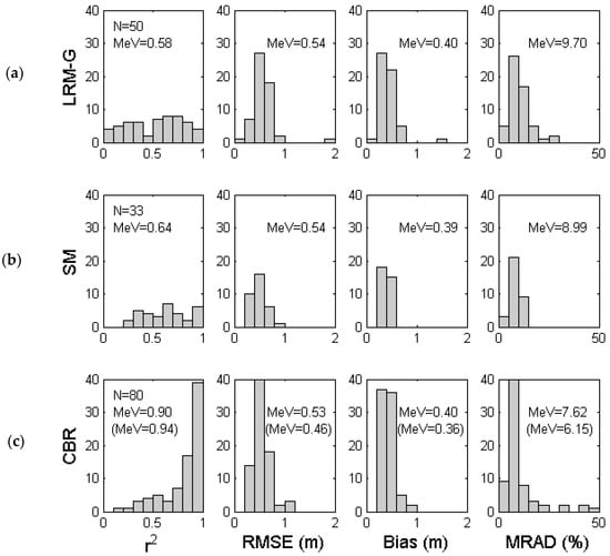 Distribution of performance of empirical SDB approaches for (a) the linear regression model using the log-transformed G-band (LRM-G); (b) the switching algorithm using LRM-G and LRM-R (SM); and (c) the cluster-based regression model (CBR). Performance is quantified using the coefficient of determination (r2), the root mean square error (RMSE), the bias (Bias), and the mean relative absolute difference (MRAD). N is the number of satellite images; MeV is the median value. The MeV value between parentheses is calculated using the 33 best satellite scenes.