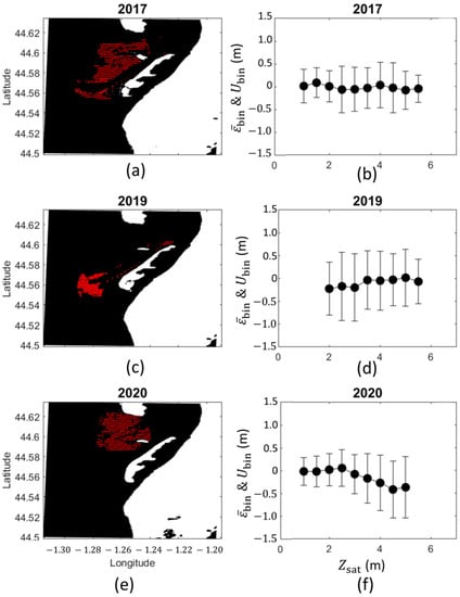Three periods of 1 month each were identified to derive SDB and uncertainty maps from the multi-scene approach. The first period in October 2017 was covered by six satellite images. The second and third periods were centered on the months of September 2019 and September 2020, including, respectively, five and four satellite images of high quality. Field bathymetry datasets associated with these two last periods were composed of 2148 and 2802 sounding points, respectively. In comparison to the 2017 bathymetric survey, the spatial distributions of the bathymetric data points in 2019 and 2020 were smaller (Figure 9a,c,e). In 2020, field bathymetry data were mainly located on the spit platform, while the data collected in 2020, were gathered along the southern part of the inlet. Consequently, the bathymetry acquired in 2017, 2019, and 2020 showed different frequency distributions with median values of 3.8 m, 4.3 m, and 3.3 m, respectively.