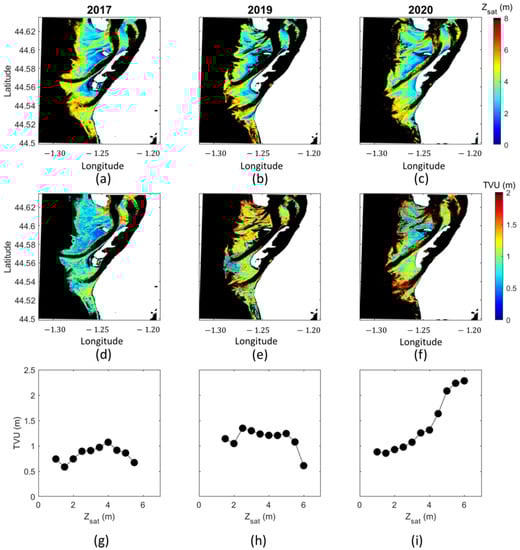 SDB and uncertainty maps, generated from the multi-scene approach, for the three 1-month time periods are presented in Figure 10. Most of the study site area was covered by the SDB models (Figure 10a–c), except for optically deep regions (ocean and tidal channels). The TVU map of 2017 shows values lower or equal to 1 m, except for the northern section of the inlet inner part where more turbid seawaters could generate higher uncertainties (Figure 10d). In 2019 and 2020, areas with uncertainties higher than 1 m (Figure 10e,f) showed larger cumulative surfaces than the ones in 2017. The mean values of TVU for each bin of were displayed for the three years (Figure 10g–i). The average values were 0.89, 1.21, and 1.41 m, respectively. In 2017, all TVU averaged values were lower than 1.1 m, with a minimum observed for bathymetric values ranging from 1 to 1.5 m and a maximum value for the ones ranging from 4 to 4.5 m. In 2019, the maximum value of TVU was observed for bathymetric values comprised between 2 and 2.5 m, while the minimum value was observed for deeper waters. In 2020, the maximum TVU values were observed for deeper waters. These results may directly be associated with the specific spatial distribution of sounding points in 2019 and 2020, reducing the quality of the representativeness of the calibration dataset.