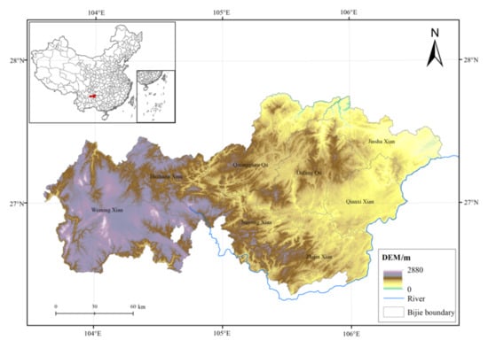 Bijie City is located in the northwest of Guizhou Province (105°36′–106°43′E, 26°21′–27°46′N, Figure 1), with an area of about 26,853 km2, accounting for 15% of Guizhou Province. Bijie mainly has a subtropical humid monsoon climate with rain and heat over the same periods. The precipitation is abundant with an average annual precipitation of 727.3–1193.2 mm and an average temperature of 10–15 °C. The average elevation of Bijie City ranges from 457 to 2900 m, and its terrain types are mainly composed of mountain and plateau. The mainly soil type in this study area is red soil. The land-use types are mainly composed of woodland and grassland. Woodland has the largest distribution area, followed by grassland. The karst landform in Bijie City is well developed, and limestone and dolomite are widely distributed, accounting for about 60% of the total area.