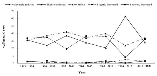 In order to further analyze the change trend of rocky desertification in Bijie City, this study calculated and obtained the spatial distribution of the change intensity (CI) of rocky desertification and the area proportion of different levels of rocky desertification change intensity (CI ≤ −0.04 as severely reduced, −0.04 < CI ≤ −0.02 as slightly reduced, −0.02 < CI ≤ 0.02 as stable area, 0.02 < CI ≤ 0.04 as slightly increased, CI > 0.04 as severely increased) during 1985–2020 (Figure 7 and Figure 8).