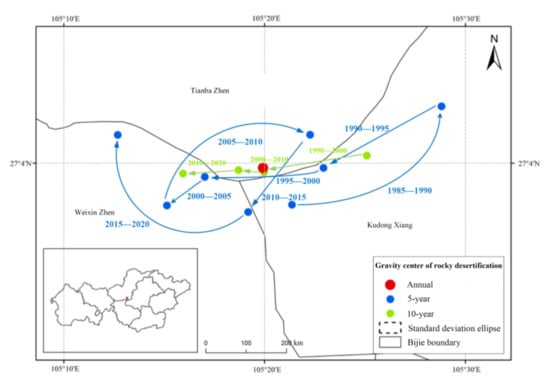 - During 1985–2020, there was an overall decreasing trend of rocky desertification in Bijie City (weakening–aggravating–weakening). The gravity center of rocky desertification moved westward, indicating that the aggravation degree of rocky desertification in the western region of the study area is higher than that in the eastern region.
