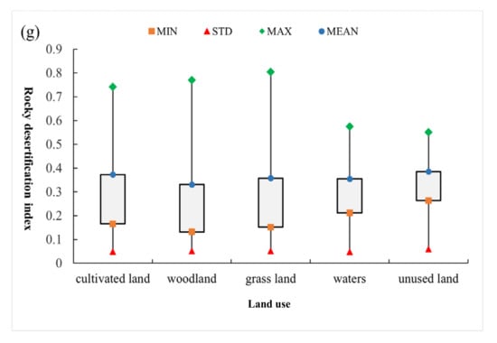 In order to explore the influence mechanism of different factors on the evolution of rocky desertification, this study selected eight typical factors, including precipitation, temperature, vegetation coverage, population (POP) density, gross domestic product (GDP) density, slope, elevation, and land use, to analyze the correlations. Figure 10a shows that the standard deviation of the rocky desertification index in precipitation zones of 1150–1250 mm was the smallest, indicating that the homogeneity of spatial distribution of rocky desertification in this zone was higher. The average index of rocky desertification at a precipitation zone of 750–850 mm was the largest, indicating that the rocky desertification in this area was the most serious. Figure 10b shows that the average index and standard deviation of rocky desertification at a vegetation coverage zone of 0.8–1 were the smallest, indicating that the rocky desertification in high vegetation areas was generally slighter. Figure 10c shows that with the increase in population density, the average rocky desertification index first decreased and then increased, while the rocky desertification index was the smallest in zones with 240–300 person/km2. The standard deviation of the rocky desertification index showed an increasing trend with the enlargement of population density, indicating that the spatial heterogeneity of regional rocky desertification became greater with the increasing human disturbance intensity. Figure 10d shows that the average rocky desertification index decreased first, then increased, and finally, decreased, while the rocky desertification index was relatively smaller in zones of 900,000–1,300,000 Yuan/km2, which indicated that with the increase in human disturbance intensity, the rocky desertification became more serious. However, positive interference, such as ecological protection, gradually became the dominant factor when the economic development reached a certain level, which contributed to the improvement of rocky desertification. As shown in Figure 10e, the average rocky desertification index first decreased and then increased with the enlargement of the slope, and the average rocky desertification index was the smallest at a slope zone of 15°–25°. Figure 10f shows that the average rocky desertification index fluctuated with the increase in elevation, which indicated that moderate and severe rocky desertification occurred mostly in middle- and high-elevation zones. Figure 10g shows that the average index and standard deviation of rocky desertification in unused land were the largest, while the rocky desertification in forest land was relatively slighter.