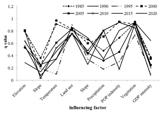 In addition, this study utilized GeoDetector to analyze and determine the dominant influencing factors (elevation, aspect, temperature, land use, slope, precipitation, population density, vegetation coverage, GDP density) of rocky desertification in Bijie City in 1985, 1990, 1995, 2000, 2005, 2010, 2015, and 2020. The dominant factors were identified and displayed in Figure 11: 1985 (vegetation coverage, q = 0.93), 1990 (vegetation coverage, q = 0.94), 1995 (land use, q = 0.90), 2000 (air temperature, q = 0.97), 2005 (vegetation coverage, q = 0.95), 2010 (vegetation coverage, q = 0.92), 2015 (POP density, q = 0.94), and 2020 (POP density, q = 0.94). During the past 35 years, the dominant driving factor in the evolution of rocky desertification in Bijie City shifted from natural factor to human activity factor.