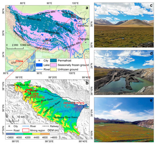 Overview of the study area. (a) Spatial distribution of permafrost region in the Qinghai-Tibet Plateau (QTP) (the permafrost map is from [45]); (b) digital elevation model (DEM) of the study area; (c) natural landscape in the neighborhood of the mines; (d) waterlogged open-pit mine; and (e) demonstration area showing the mining restoration and treatment.