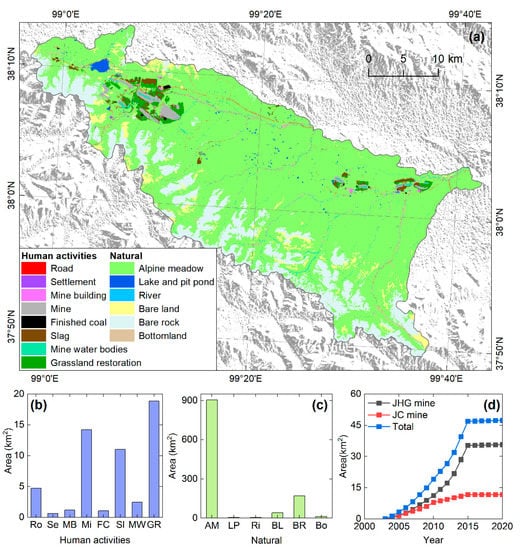 Land use/land cover (LULC) (2020) and mining development (2003–2020) in the Muli region. (a) LULC map of the Muli region in 2020; Statistical map of (b) human activities and (c) natural land in the Muli region in 2020; (d) graph of mining development process in the Muli region from 2003 to 2020. Notes: Ro: road; Se: settlement; MB: mine building; Mi: mine; FC: finished coal; Sl: slag; MW: mine water bodies; GR: grassland restoration; AM: alpine meadow; LP: lake and pit pond; Ri: river; BL: bare land; BR: bare rock; Bo: bottomland.