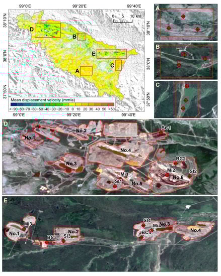 Spatial distribution of mean displacement velocity in the Muli region from 2018 to 2020 (Positive and negative values represent uplift and subsidence along the line-of sight (LOS), respectively). Notes: (1) (A): stable region of mountain bare rock; (B): subsidence region of alpine marsh meadow; (C): uplift region of alpine meadow; (D): JHG mining area; (E): JC mining area. (2) BC: characteristic point of mine building and finished coal area; Mi: characteristic point of mine; Sl: characteristic point of slag. (3) (A–E) base map is a Gaofen−1 image acquired on 26 July 2020 (RGB 1−2−3).