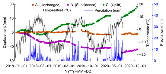 According to the characteristic point time series displacement of three typical regions, namely, the stable region of mountain bare rock (A, mean displacement velocity −0.87 mm/a), the subsidence region of alpine marsh meadow (B, mean displacement velocity −12.40 mm/a), and the uplift region of alpine meadow (C, mean displacement velocity 2.85 mm/a) (Figure 4), the surface displacement in bare rock region fluctuated around zero, and there was no obvious periodic deformation trend. The time series displacement of alpine marsh meadow presented a trend of periodic and linear slow subsidence. The time series displacement of alpine meadow showed a trend of periodic and linear slow uplift. Both alpine marsh meadow and alpine meadow are characteristics of obvious freeze-thaw cycles on permafrost surface. Combined with the temperature and precipitation data of Muli Town meteorological station, the annual periodic thaw process in the permafrost region in 2018–2020 started from the end of April or early May to the end of September or early October, and the surface subsidence reached the maximum value. The freeze process started in early October and continued until early May of the following year. The change of permafrost displacement was observed to lag behind climate change. The maximum temperature and precipitation appeared at the end of July or early August, and the maximum time lag of surface thaw subsidence was approximately 60 days. The minimum temperature and precipitation appeared in the end of January or early February, and the maximum time lag of surface freeze uplift was approximately 90 days.