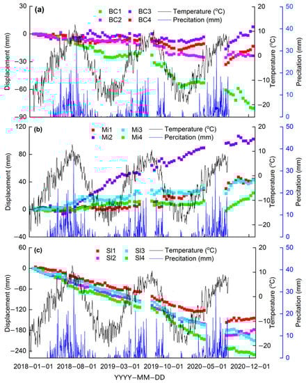 The typical points of mine, slag, mine building, and finished coal area are shown in Figure 5. The times series displacement at the typical points in the mining area exhibited no obvious periodic change rules of freeze uplift and thaw subsidence. However, in winter, when the temperature was the lowest, the typical points of the BC1-BC4 showed that the subsidence displacement reached the maximum value and then started decreasing slowly. All of the displacements are in the state of subsidence. An increase in fluctuation was observed, and the maximum displace was −80.4 mm. The displacement of the typical points of Mi1–Mi4 showed uplift and linearly increased, and the maximum displacement of uplift was 23.9–106.5 mm. The displacement of the typical points of Sl1–Sl4 showed subsidence and linearly increase. The displacement was higher than the displacement of other typical points, and the maximum displacement was −157.0 to −250.3 mm.