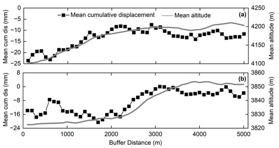 Further, the influence of open-pit coal mining on permafrost surface deformation in the Muli region was analyzed and evaluated. Based on the boundaries of JHG and JC mining areas, a total of 50 buffer gradient regions (within 5 km outside the mining area) were set at 100 m intervals. The mean value of cumulative displacement was calculated in the buffer gradient region from January 2018 to December 2020. The mean value of cumulative displacement varying with buffer distance was analyzed.