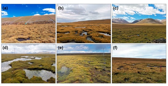 Field photos of alpine marsh meadow in different buffer zones outside mining area. (a) JHG coal mine No. 6, 0–100 m buffer zone; (b) JHG coal mine No. 4, 100–200 m buffer zone; (c) JHG coal mine No. 6, 700–800 m buffer zone; (d) JC coal mine No. 2, 100–200 m buffer zone; (e) JC coal mine No. 2, 700–800 m buffer zone, and; (f) JC coal mine No. 3, 1100–1200 m buffer zone.
