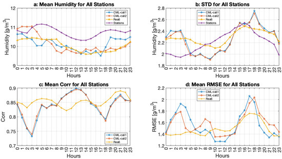Figure 2 shows the mean diurnal cycles over the studied period. Mean (panel a) and STD (panel b) of CML-HO, WS-HO, and Rea6, and the correlation (panel c) and RMSE (panel d) between WS-HO and both sources, CML-HO and Rea6, averaged over all the stations’ locations and all the metrics averaged over all the stations’ locations.