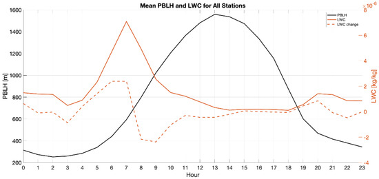 Another feature that we notice in the mean CML-HO values is its steep increase between 17–19 LT in comparison to the WS-HO and Rea6 values for the cali1 case (Figure 2a). This is still evident in some stations when applying the second method for calibration (cali2, not shown here). Considering that these are early morning and evening hours, the excess mean CML-HO may result from increased attenuation due to other factors, rather than from WV, such as condensation of water in the air due to the nocturnal temperature drops, advection of fog, or condensation of water on the antenna [33,34,35,36]. The LWC (liquid water content) average diurnal pattern for all the stations, shown in Figure 4, implies condensation of WV during the early morning hours when the PBLH and the temperatures are, on average, relatively low.