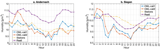 Diurnal CML-HO (CML-cali1/2), WS-HO (Stations), and Rea6 for two stations with a different CML-HO behavior. (a) A station with high humidity values at night, as observed at the WS, that gradually decrease until the morning. At this station, there is no significant decrease at night, and a similar pattern to the Rea6 is observed during the day. (b) A station with low CML-HO values as compared to WS-HO at night. The same calibration equation for all hours was applied (red, cali2). Rea6 is yellow and WS-HO is purple.