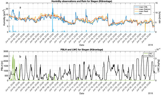 (a) Upper panel: hourly humidity observations for June 2018 from CML, stations, and Rea6 (scale on left), as well as hourly precipitation (light blue, rain scale on right in mm/h) at the Siegen station. (b) LWC (kg/kg in red) and PBLH (meters, in black) from the ECMWF operational archive and Rea6 (respectively) for June 2018.