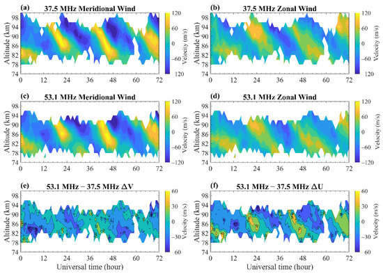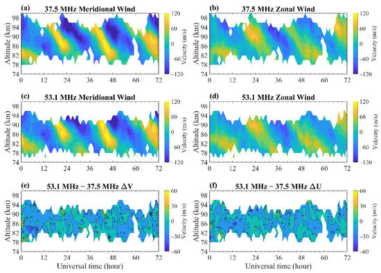 Figure 2 presents the hourly mean horizontal winds observed by the 37.5 MHz and 53.1 MHz MRs from 8 November 2013 to 10 November 2013. The winds were calculated using the all-sky method. As shown in Figure 2a–d, the hourly winds observed by the two MRs are very similar, and both reflect a distinct diurnal tidal structure. The wind differences between the two MRs in Figure 2e–f still present a weak tidal structure, especially in the zonal component. We investigate the reasons for this below.