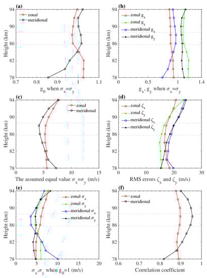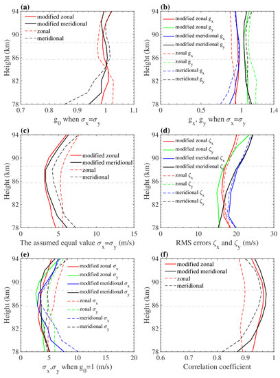 Summary of the numerical parameters at heights of 78–94 km for the two MRs: (a) optimal slope assuming that ; (b) slopes of the least squares regression fits of the 53.1 MHz MR results against the 37.5 MHz MR results and of the 37.5 MHz MR results against the 53.1 MHz MR results; (c) results obtained by assuming equal values and ; (d) RMS continuous errors of the two systems; (e) and when ; (f) correlation coefficients between the two MR measurements. The red and green lines correspond to the zonal component, and the blue and black lines correspond to the meridional component. The subscripts x and y represent the 37.5 MHz and 53.1 MHz MRs, respectively. The gray dashed lines correspond to the meteor peak height for both MRs.