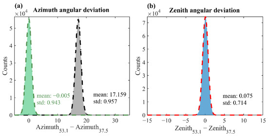 Histograms of the deviations in the (a) azimuth and (b) zenith reference directions for simultaneously observed meteor echoes. The dashed lines represent the best-fitting Gaussian curves. When the deviation from the azimuth reference direction between the two MRs is approximately 17°, the count of simultaneous meteor echoes reaches the maximum. The green and gray lines represent the statistical differences in the azimuth angles before and after the angular correction, respectively. The mean and standard deviation are also labeled.