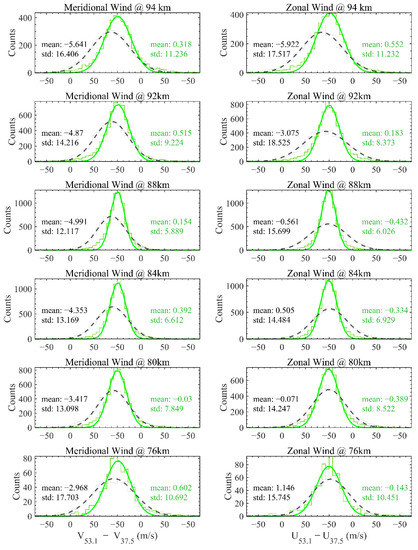 Histograms of the differences in the meridional and zonal wind velocity estimates at 76–94 km between the 53.1 MHz and 37.5 MHz MRs before (black) and after (green) applying the angular correction. The smoothed curves represent Gaussian distributions with the fitted mean and variance, and the mean and standard deviation are labeled.