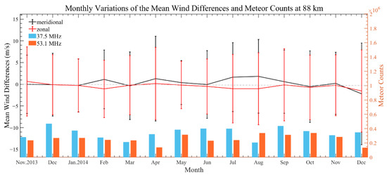 The monthly variations of the mean wind differences and meteor counts at 88 km. The red and black lines are the monthly mean wind differences with standard deviation error bars corresponding to the zonal and meridional wind components, respectively. The blue and orange bars represent the monthly meteor counts of the 37.5 MHz MR and the 53.1 MHz MR. The gray dashed line represents the mean wind difference of 0.