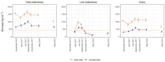 Total understorey and grass biomass were significantly higher in open sites compared to woodland sites across all seasons (Figure 2). For live understorey biomass, this trend was only seen during winter and spring. Live biomass was similar across all vegetation types during the drier summer and autumn months (Figure 2). For more detail, refer to Riquelme et al. [37].