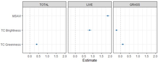 Brightness combined with MSAVI best explained live understorey biomass, and brightness and greenness accounted for the most variation in grass biomass (Table 3). Greenness alone best explained variation in total understorey biomass (Table 3), although the next-best model (brightness plus greenness) only had a difference in AIC of 3.62 (Table S1, Supplementary Materials).