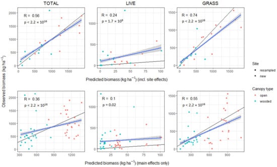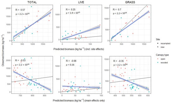 The predictive ability of the models’ main effects improved when including soil moisture, tree cover, and dominant understorey growth form: correlation between predicted and observed live biomass increased by 0.16, by 0.89 for total, and by 0.9 for grass biomass (Figure 7). Predictive ability when including site effects was little changed (Figure 7).