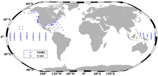 To collocate AMSR2 brightness temperature measurements, we collect buoy observations from the National Data Buoy Center (NDBC) and the Tropical Atmosphere Ocean Project (TAO) [16]. We chose a total of 94 NDBC buoys in the northwest Atlantic, northeast Pacific, Gulf of Mexico, Gulf of Alaska, and Bering Sea and 71 TAO buoys located in the equatorial regions. In order to avoid the observed brightness temperatures being contaminated by land, these selective buoys are at least 30 km far from the coast [17]. The buoy locations are illustrated in Figure 1. NDBC buoys provide hourly measurements of sea surface wind speed, sea surface temperature, near-surface air temperature, and dewpoint temperature. TAO buoys also measure these parameters and relative humidity, except for dewpoint temperature. Because NDBC buoys do not provide relative humidity measurements, we use the August-Roche-Magnus approximation [18] to estimate relative humidity with buoy-measured air temperature and dewpoint temperature.
