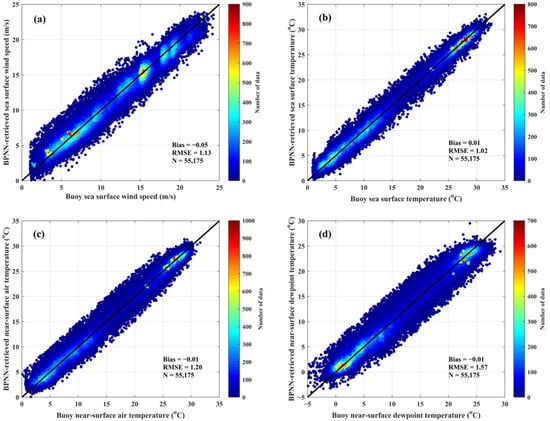 Figure 3 illustrates the comparisons between the multi-parameter BPNN model-retrieved four geophysical parameters and those from the buoy measurements and reanalysis data. As shown in Figure 3a, the bias is −0.05 m/s and the root-mean-square (rms) error is 1.13 m/s. These errors are smaller than the bias (−0.52 m/s) and the rms error (1.21 m/s) of the “Hong wind speed retrieval algorithm” [3]. The rms error of the BPNN-retrieved sea surface wind speed is close to the “standard accuracy” (1.0 m/s) specified by JAXA and much less than its “release accuracy” (1.5 m/s).