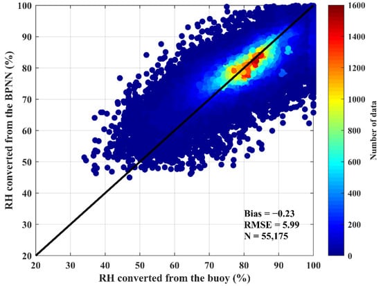Comparison of the estimated relative humidity (RH) from the BPNN retrieval and the buoy and ECMWF ERA5 data over the global oceans, for 55,175 data points from 2012 to 2020. The colored bars represent the number of data points in the specific bin. The bin size is 2 × 2%. Each colored point is located at the center of the bin.