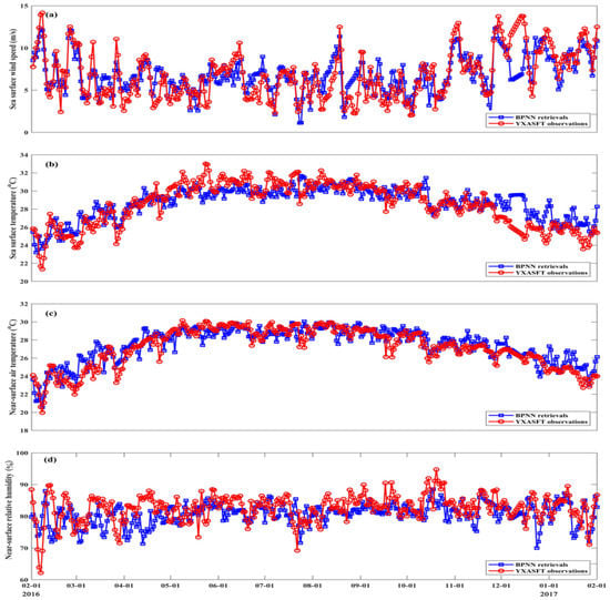 Daily time-series plots of the YXASFT-observed (red solid lines) and BPNN-retrieved (blue solid lines) (a) sea surface wind speed (WS), (b) sea surface temperature (Ts), (c) near-surface air temperature (Ta), and (d) relative humidity (RH) values over a period of 1 year (from 1 February 2016 to 31 January 2017).