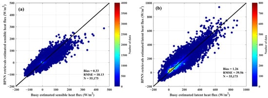 The comparison between the estimated heat fluxes from COARE 3.5 and BPNN-retrieved air–sea interface parameters (WS, Ts, Ta, RH), and those from buoy and ECMWF ERA5 data over the global oceans, for 55,175 data points from 2012 to 2020: (a) sensible and (b) latent heat flux. The colored bars represent the number of data points in the specific bin. The bin size is 5 × 5 W/m2 for (a) and 10 × 10 W/m2 for (b). Each colored point is located at the center of the bin.