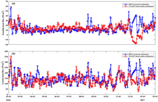 Daily time-series plots of the estimated heat fluxes (blue solid lines) from COARE 3.5 and BPNN−retrieved air−sea interface parameters (WS, Ts, Ta, RH) and YXASFT observations (red solid lines) over a period of 1 year (from 1 February 2016 to 31 January 2017): (a) sensible and (b) latent heat flux.