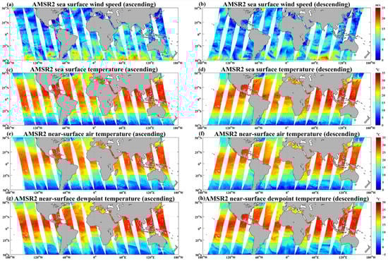The multi−parameter BPNN model retrieved the global daily instantaneous fields for sea surface wind speed (WS), sea surface temperature (Ts), near−surface air temperature (Ta), and dewpoint temperature (Td) from AMSR2 ascending and descending brightness temperature observations for 13 July 2018. Panels (a,c,e,g) represent ascending overpasses, and (b,d,f,h) stand for descending overpasses.