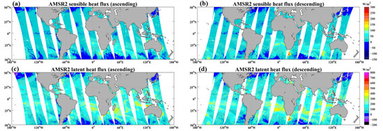 Global sea surface sensible and latent fluxes play key roles on the development and evolvement of various synoptic weather events. The Coupled Ocean-Atmosphere Response Experiment (COARE) bulk formulas, such as COARE 2.5 [7], COARE 3.0 [8], and the latest COARE 3.5 [9] have been widely applied to calculate sea surface sensible heat flux (SHF) and latent heat flux (LHF), with sea surface wind speed, sea surface temperature, near-surface air temperature, and relative humidity. Based on the COARE 3.0 algorithm, daily global gridded atmosphere-ocean heat flux products with 1° × 1° spatial resolution were created from the optimal synthesis of satellite observations and atmospheric reanalysis [10]. The daily mean SHF and LHF products have been compared with those observations from the Yongxing air–sea flux tower (YXASFT) in the South China Sea (SCS), and no significant overestimation of LHF in the spring and winter was found [11]. Furthermore, the ECMWF ERA-Interim (ERA-I), the NCEP-DOE Reanalysis 2 (NECP-2), the Japanese 55-year Reanalysis (JRA55), and the Flux product in the Tropics (TropFlux) also provide SHF and LHF over global oceans. The LHF from these five heat flux products has been evaluated using buoy observations in the SCS, with the mean biases ranging from −8 to 40 W/m2 [12]. The forementioned heat flux products, however, only focus on daily mean or monthly mean SHF and LHF with coarse resolution (1°–2°). Consequently, it is desirable to derive instantaneous estimates of global sea surface SHF and LHF from satellite daily ascending and descending measurements.