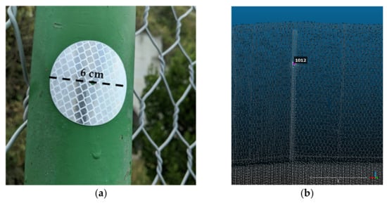 The images were appropriately calibrated according to the light conditions and the proximity of the object of investigation. In the end, a detailed scan of the targets was performed, which allowed the scanner to locate and record 7 installed reflectors (Figure 3). The choice of the instrument had good technical characteristics that largely satisfy the detail requirements such as: (a) the possibility of selecting the area to be surveyed by manually identifying it through the instrument’s control monitor; (b) the ability to reduce the shadow zones due to vegetation; (c) the 800 m operating range (100kHz laser pulse); (d) the high acquisition speed of 240 lines/s (vertical scan) [56]; (e) the high metric performance, which is confirmed by the high level of accuracy achieved in georeferencing the targets through the topographic survey carried out (Figure 4, Table 1).