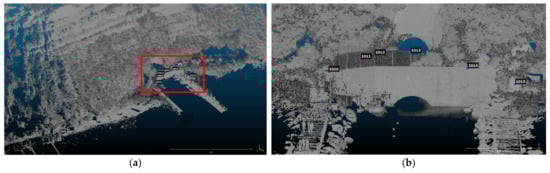 Position of the reflectors in the surveyed scene: (a) general view from the east; (b) detail of the red box shown in a.