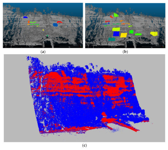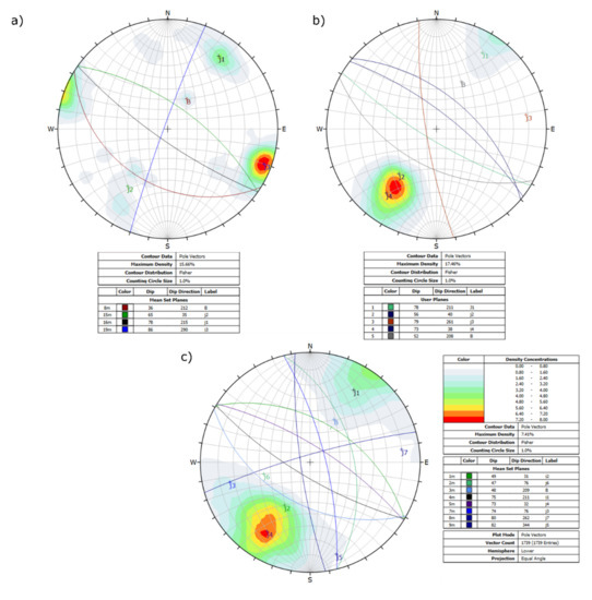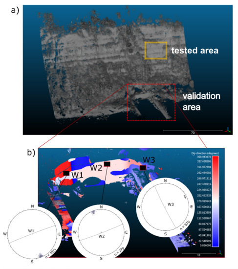 To validate the procedure for classifying the point cloud into clusters, three portions of the retaining wall located at the base of the tested area were examined (Figure 11). Three portions of the wall characterized by different dip directive values were selected and compared with the field measurement made with the geologist’s compass. The stereonets of the classified clusters are reported in Figure 11b. As expected, three different clusters were identified by the algorithm and excellent correspondence exists between them and the field measurements.