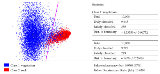 Stratigram with classifier definition in the plane of maximum separability between points belonging to the two categories, vegetation samples (blue) and rock (red). Overall balanced accuracy is 97%.