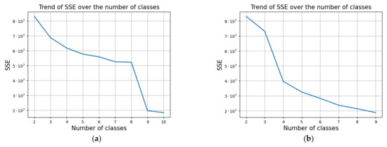 The number of clusters was estimated using the Error Sum of Squares (SSE) method that evaluates the sum of the squared distance between the centroid and each member of the cluster [45]. In this way, it is possible to derive the proper number of clusters for the data under test. A key point of our procedure regards the possibility for the users to supervise the procedure once the algorithm has classified the point cloud. In such a case, semi-supervised learning is built on the output of the unsupervised learning process. Especially when dealing with a high-resolution point cloud, the density of points with a certain value of dip and dip direction can influence the clustering result. In this way, areas of low density can be classified by the algorithm as part of another cluster, although the dip and dip direction values are considerably different. This aspect can be very important from a slope stability point of view, since less common surfaces may produce failures. On this premise, starting from values collected in situ regarding dip and dip direction (values derived from direct measurements or direct observation), it is possible to replace random centroid initialization with a manual ones.
