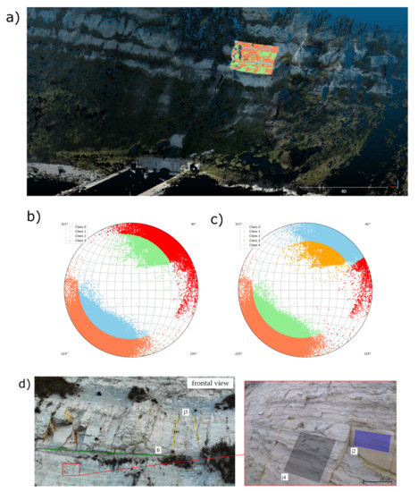 The K-means algorithm considers a set of features in the dip and dip directions. In Figure 9a, an overview of the photogrammetric images is reported, together with the classified point cloud. The colors of Figure 9a refer to the stereonet in Figure 9c. Figure 9b shows the stereonet of the results of K-means applied to our data set considering K = 4.