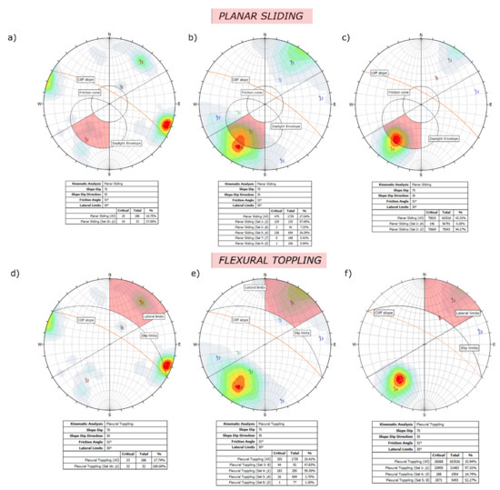 When dealing with geomechanical data of rock slopes, one of the most important applications is kinematic analysis. The kinematic analysis is the first step in rock stability assessment and involves the interpretation of spatial relations of the geological discontinuities concerning the rock slope to determine the potential for the various kinematics, such as planar sliding, and wedge or toppling sliding [57,59]. For the Cardeto–Passetto cliff, a kinematic analysis of planar failure and toppling failure was conducted using the Rocscience DIPS v. 7.0 program [55], with the aim to identify the main slope kinematics of this area and to compare the results with the TLS survey. The analysis, called Markland’s test [35], follows the procedure described in [55], plotting and analyzing the orientation pattern on stereonet, and calculating the probability of any failure mode considering the relationship between the geometry of the slope and the friction angle. Discontinuity data were plotted on equal-area projections (Lambert–Schmidt equatorial nets).