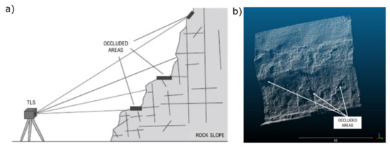In rock mass characterization, a good understanding of the discontinuity network within a rock mass, such as joints and bedding planes, is essential to control failure mechanisms. To this aim, the description of discontinuity properties such as spacing, persistence, roughness, weathering, infilling, etc. is important for engineering design [1,2] and can be performed in the field using standardized methods, such as scanline surveys [3,4] or more recently, the use of remote sensing techniques such as Laser Scanning coupled with a semi-automated discontinuity analysis [5,6,7]. Although the measure of discontinuity orientation based on the geological compass is the most accepted, large errors may be introduced due to sampling difficulties caused by the inaccessibility of the site, representativeness of the data, and considerable safety risks due to unstable slopes [8]. The data collection based on point cloud analysis has both advantages and disadvantages in rock slope engineering [6,7]. The main advantage is that the laser scanning surveys can be carried out rapidly and at a distance that allows for safe surveying and permits obtaining a rapid and consistent discontinuity properties database of inaccessible spots [7]. However, limitations and biases related to the surface coverage and orientation of the laser beam must be considered [9,10,11].